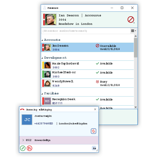 With desktop control of your handset you can utilise the power of your telephone system from within the applications you use everyday. Click to dial from Outlook, screen pop your business application system, see your team’s presence and easily transfer calls all from your desktop.
