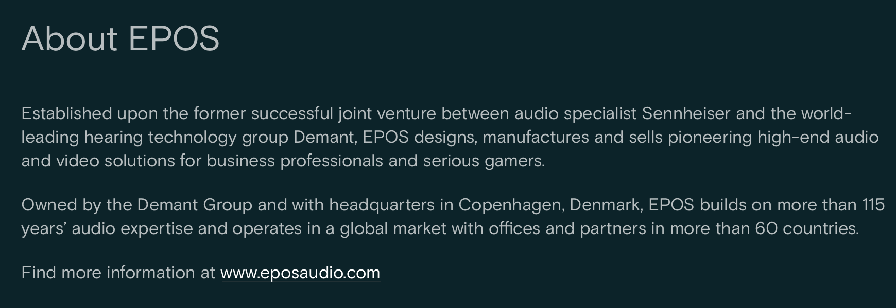 EPOS Recognized by Frost & Sullivan with 2021 GlobalCompetitive Strategy Leadership AwardEPOS demonstrates a fast-growing reputation for excellence and a proven ability to address rapidly changing customer requirements through continuous innovations and strong partnerships. SANTA CLARA, Calif. – June 29, 2021 — EPOS, the premium audio and video solutions company, has been recognized with the 2021 Global Competitive Strategy Leadership Award by Frost & Sullivan based on its recent analysis of the global professional headset market. "Rather than lose momentum and market timing due to the divesture of the joint venture, EPOS grew from strength to strength," said Mohamed Alaa Saayed, ICT Industry Director. "The transition took place in the midst of COVID-19, which added a fresh set of challenges. EPOS responded admirably by not only announcing innovations and partnerships but by efficiently and diligently addressing customer demands. Consequently, EPOS emerged as a leading provider of high-end audio solutions for enterprises and gamers." EPOS also invigorated its product line with new endpoint categories, product models, and general product enhancements. Prominent launches include the premium over-the-ear ADAPT 660 Bluetooth UC headset with AI technology, the ADAPT 100 and 200 UC series (a range of high-quality headsets that use EPOS Voice™ technology and a noise-canceling microphone to optimize the user’s voice); and the intelligent video bar EXPAND Vision 3T for today’s smart office. Furthermore, EPOS expanded its portfolio of Microsoft Teams-certified headsets, launched new gaming headsets, announced partnerships with different technology providers, and released the EPOS Connect App, a software application for firmware updates and audio control. EPOS established its reputation by providing solutions with superior audio quality and background noise cancellation, product design and style, ergonomic comfort, durability, and device integration through different multi-connectivity options. Since 2019, this newly formed company has built upon Demant’s more than 115-year heritage of rich audio technology experience and created new subsidiaries, ERP and CRM systems, and new eCommerce solutions, demonstrating an ability to respond to altered market conditions holistically. "EPOS offers superior customer service with multiple tools for support, inquiries, and problem-solving," noted Saayed. "Its commitment to world-class customer experiences, flexibility in responding to market demands, and frequent product introductions are expected to help the company reinforce its position as a leading innovator." Each year, Frost & Sullivan presents this award to the company that has leveraged competitive intelligence to successfully execute a strategy that results in stronger market share, competitive brand positioning, and customer satisfaction. Frost & Sullivan Best Practices awards recognize companies in a variety of regional and global markets for demonstrating outstanding achievement and superior performance in areas such as leadership, technological innovation, customer service, and strategic product development. Industry analysts compare market participants and measure performance through in-depth interviews, analysis, and extensive secondary research to identify best practices in the industry. President at EPOS, Jeppe Dalberg-Larsen states: "We are delighted and proud to be recognized with this award, which is a testament to the exceptional efforts and dedication of our employees globally and the passion they bring to meeting changing customer needs and providing cutting edge audio solutions."