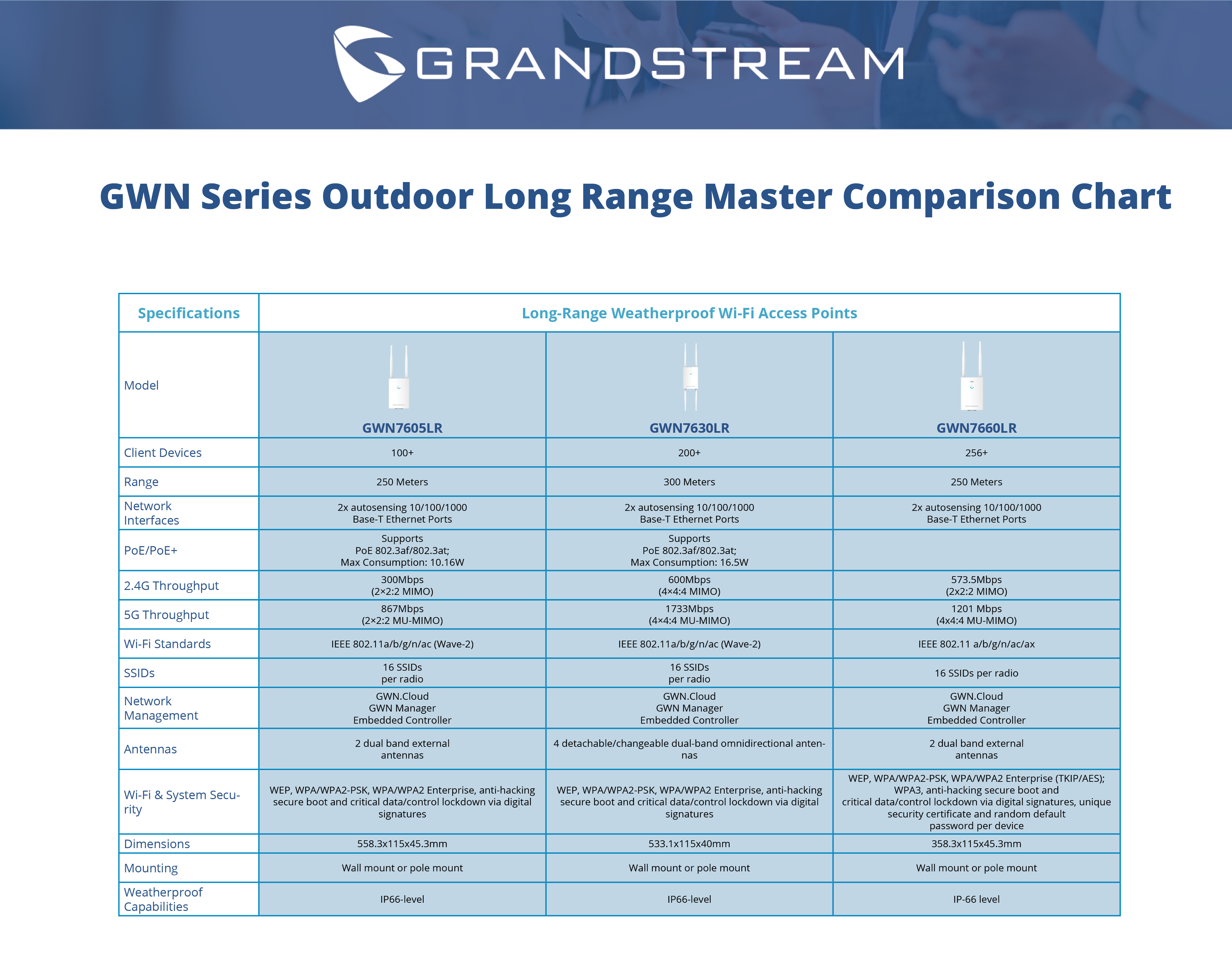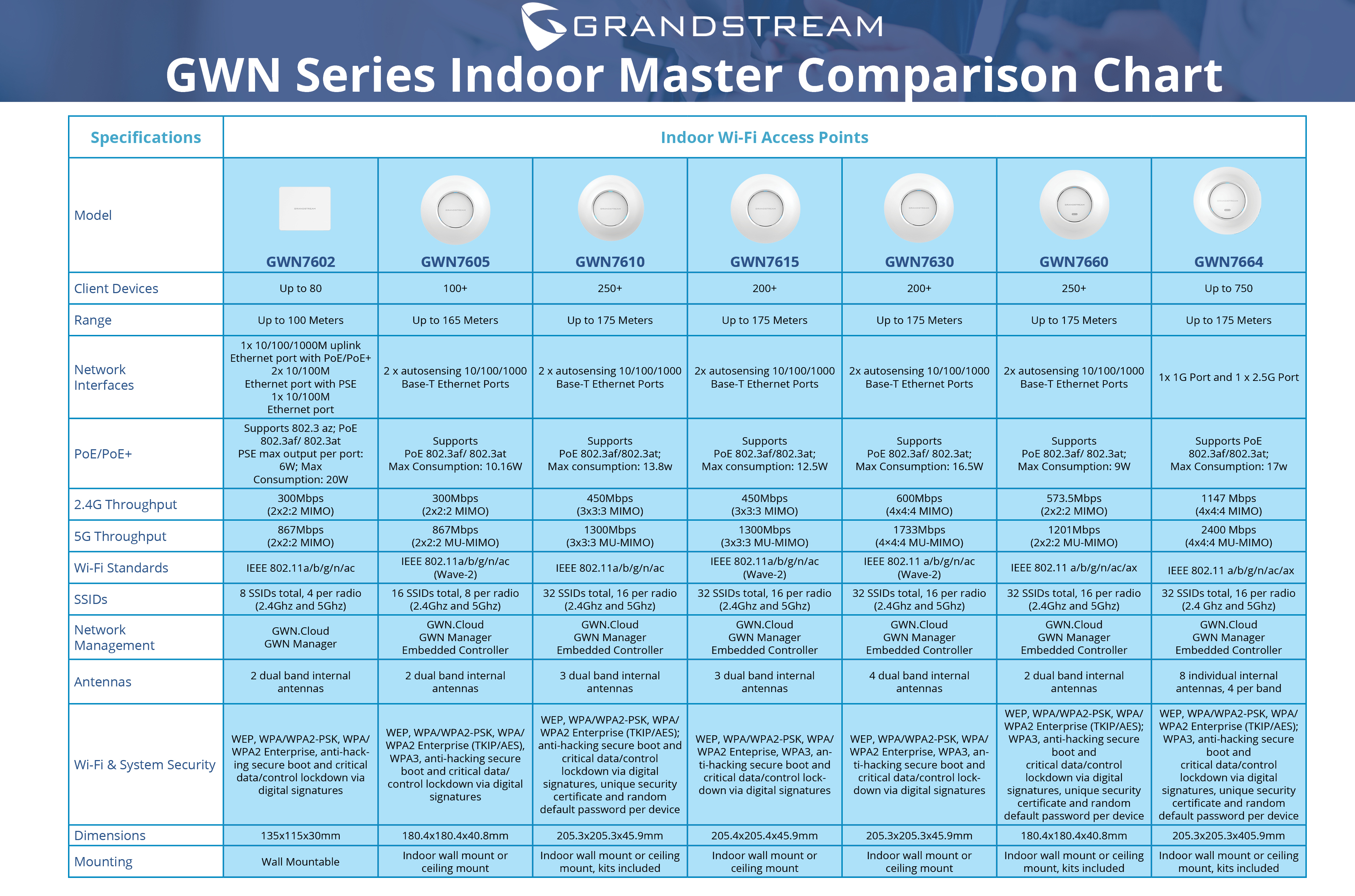 Smaller user density deployments such as a small office, coffee shop, hotel room, or restaurant would require devices with moderate capacity and internet speeds such as the GWN7602 or for outdoor deployments, the GWN7605LR. Both these access points have a total throughput of 1.27Gbps and with 2x2:2 MIMO technology, can support up to 100 active client devices. For deployments in environments with high user density such as a school or large office building, models like the GWN7630 or GWN7660 would be ideal for strong connectivity. For more specific information about Grandstream’s GWN Wi-Fi Access Points, take a look at the line comparison chart below.