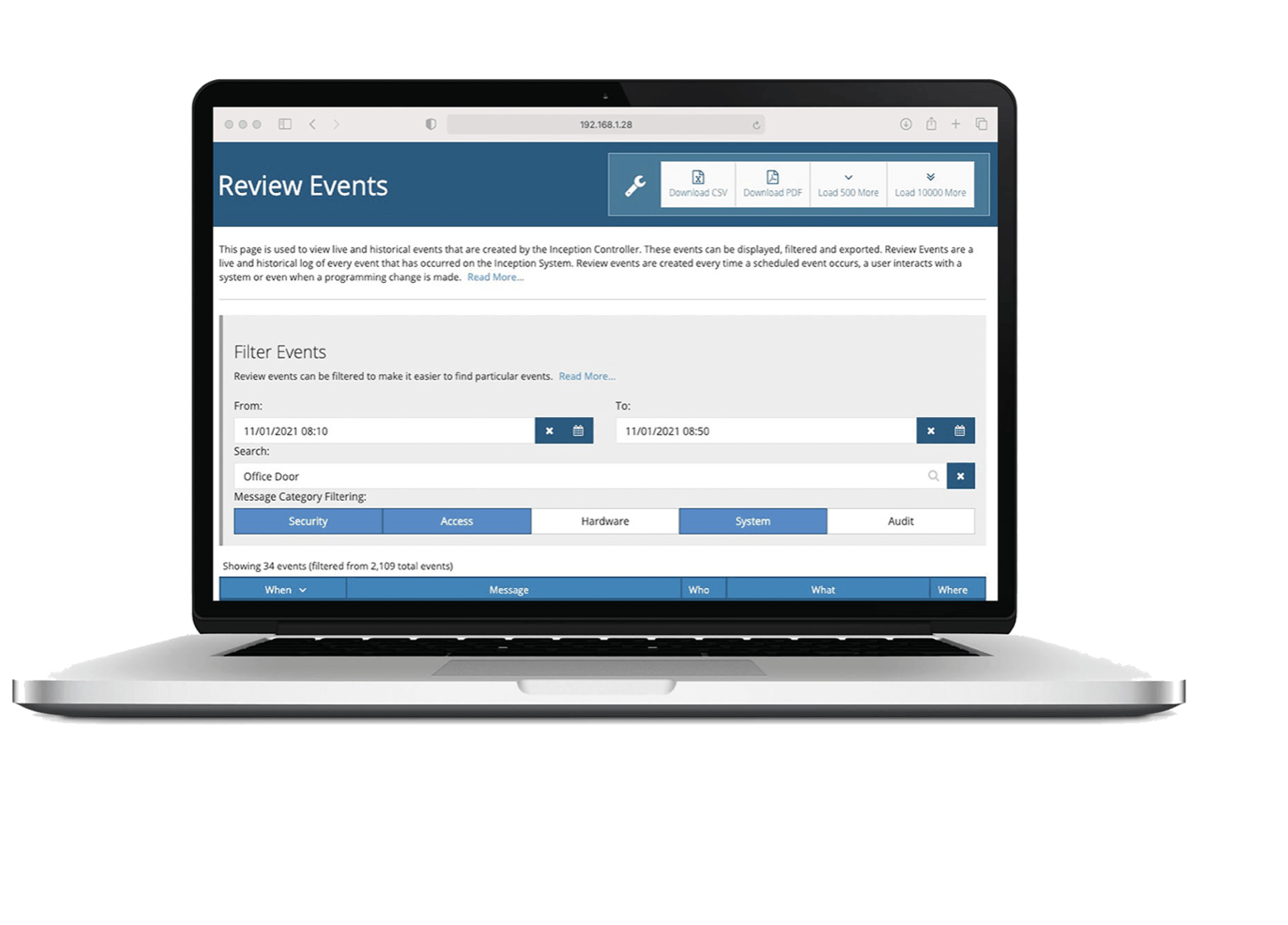 These reports show a list of events through doors and are filterable by Users, Doors or Lift Cars, and Access Granted/Denied Status.