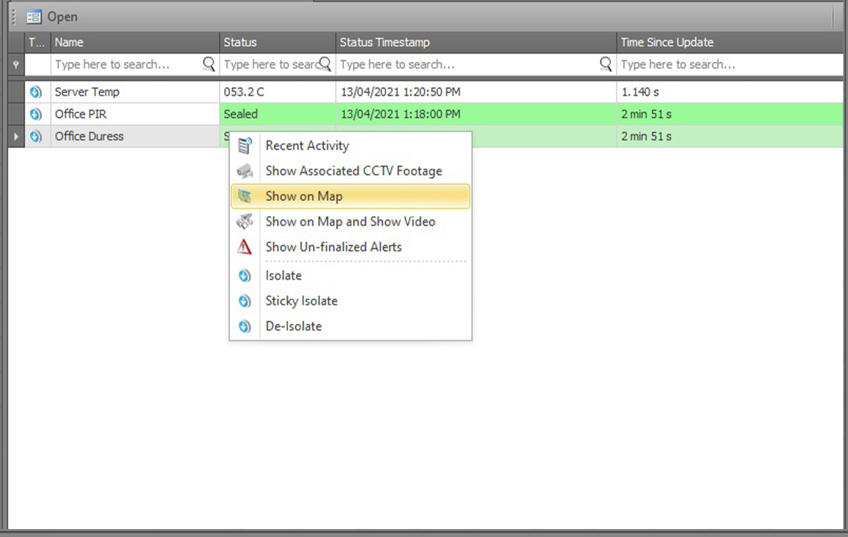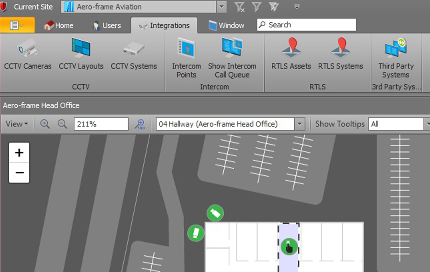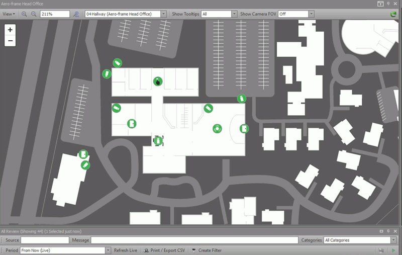 The new 'Show CCTV at Point' option gives operators the ability to rapidly gain situational awareness during highly dynamic events.The operator simply needs to right-click on a specific area of the Schematic and select Show CCTV at Point. All cameras with a Field Of View (FOV) covering the area will be shown to the operator, and any Pan Tilt Zoom (PTZ) cameras will be triggered to go to the appropriate preset. |